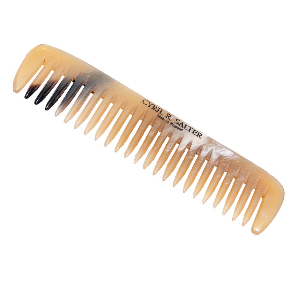 Hřeben z pravé rohoviny od Cyril R Salter s ručně leštěnými zuby pro úpravu plnovousu. Na rozdíl od jemných hřebenů určených na knír je tento díky širším mezerám mezi zuby vhodný právě na plnovous. Každý hřeben je originál - liší se jak mírným zaoblením, tak i váhou a barvou rohoviny.