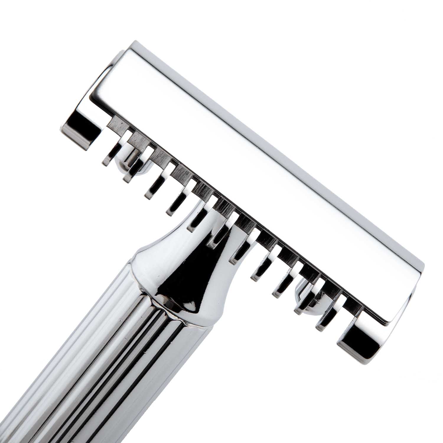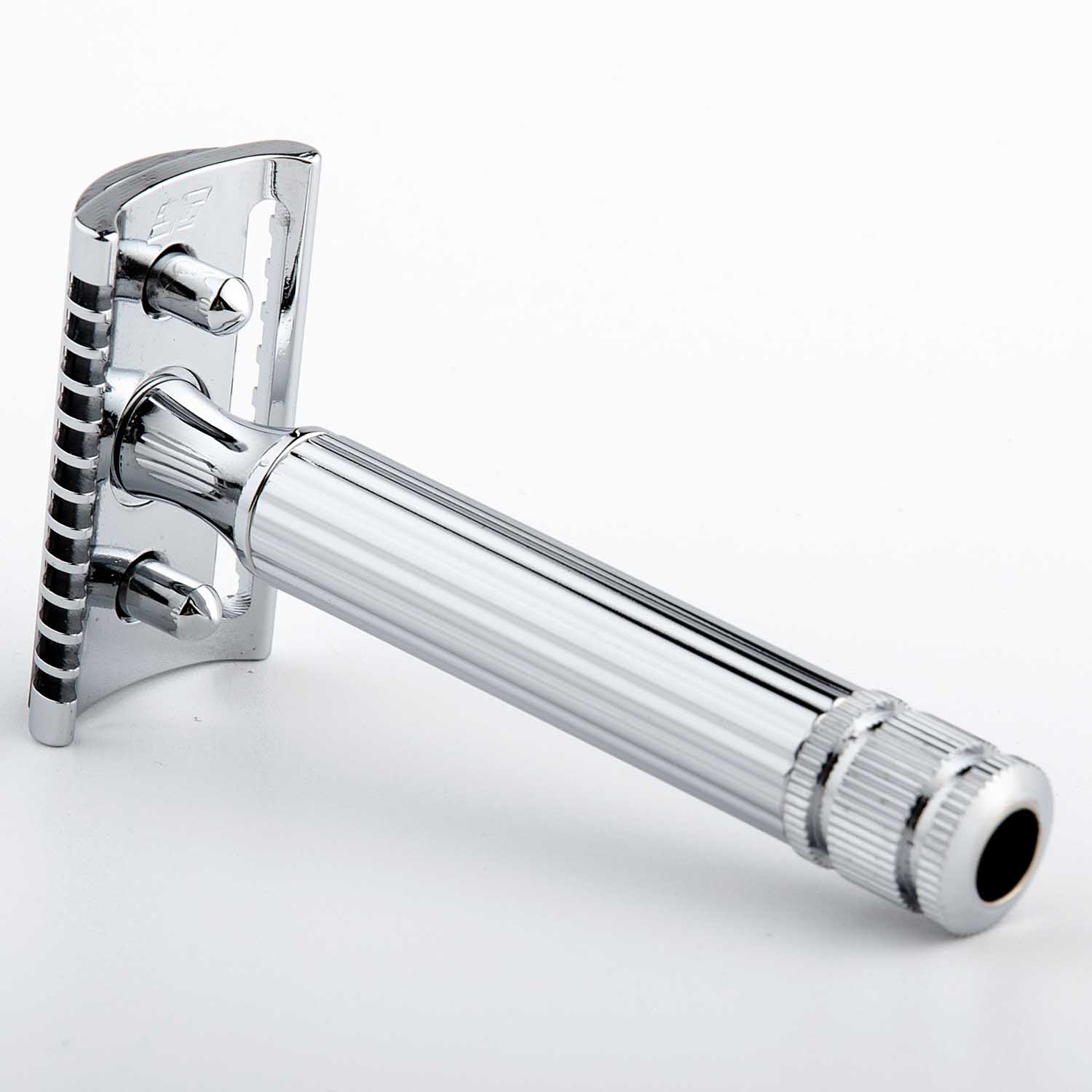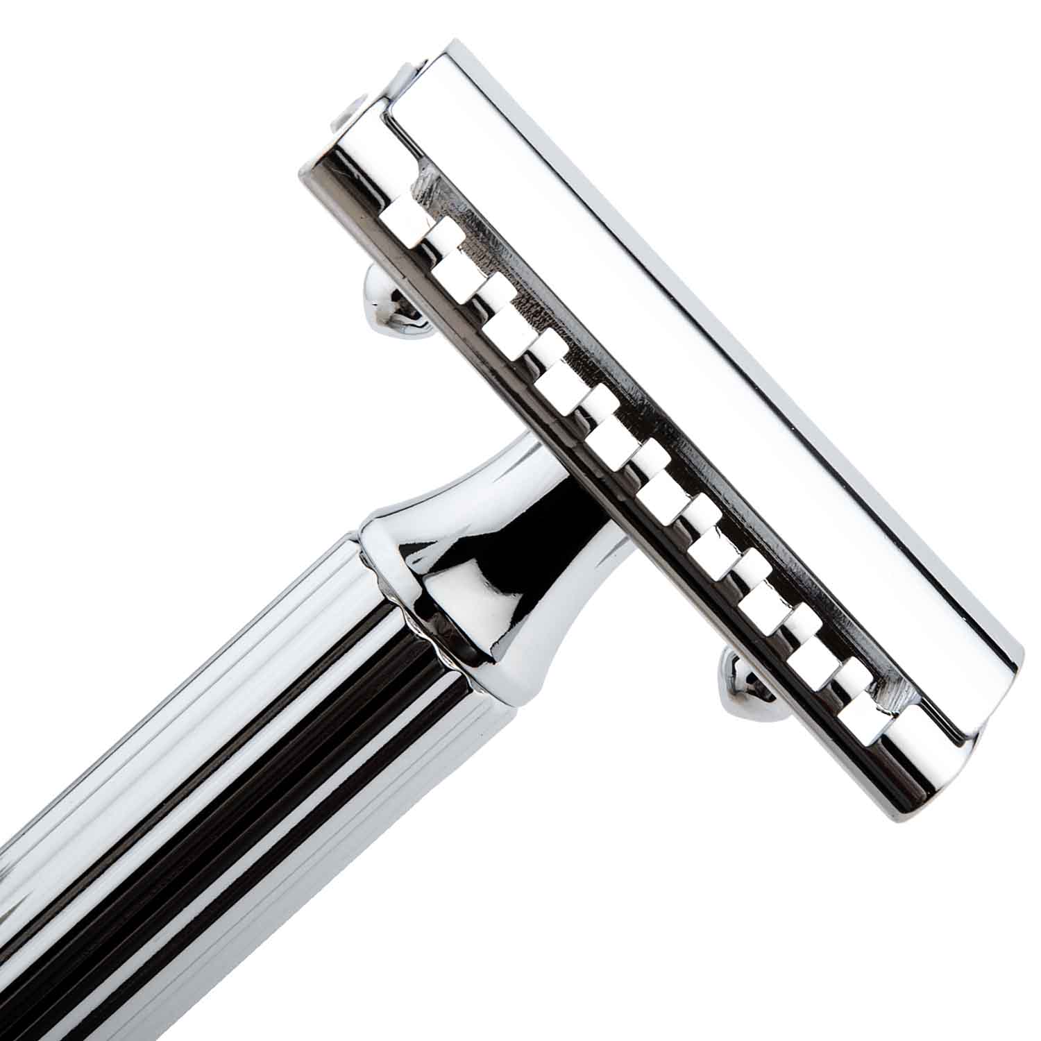Strojek je precizně vyroben z mosazi s chromovou povrchovou úpravou, která zajišťuje dlouhou životnost a nadčasový vzhled. Rukojeť v klasické řadě Grande má robustnější tvar, výborně padne do ruky a nabízí jistý úchop i při mokrém holení.