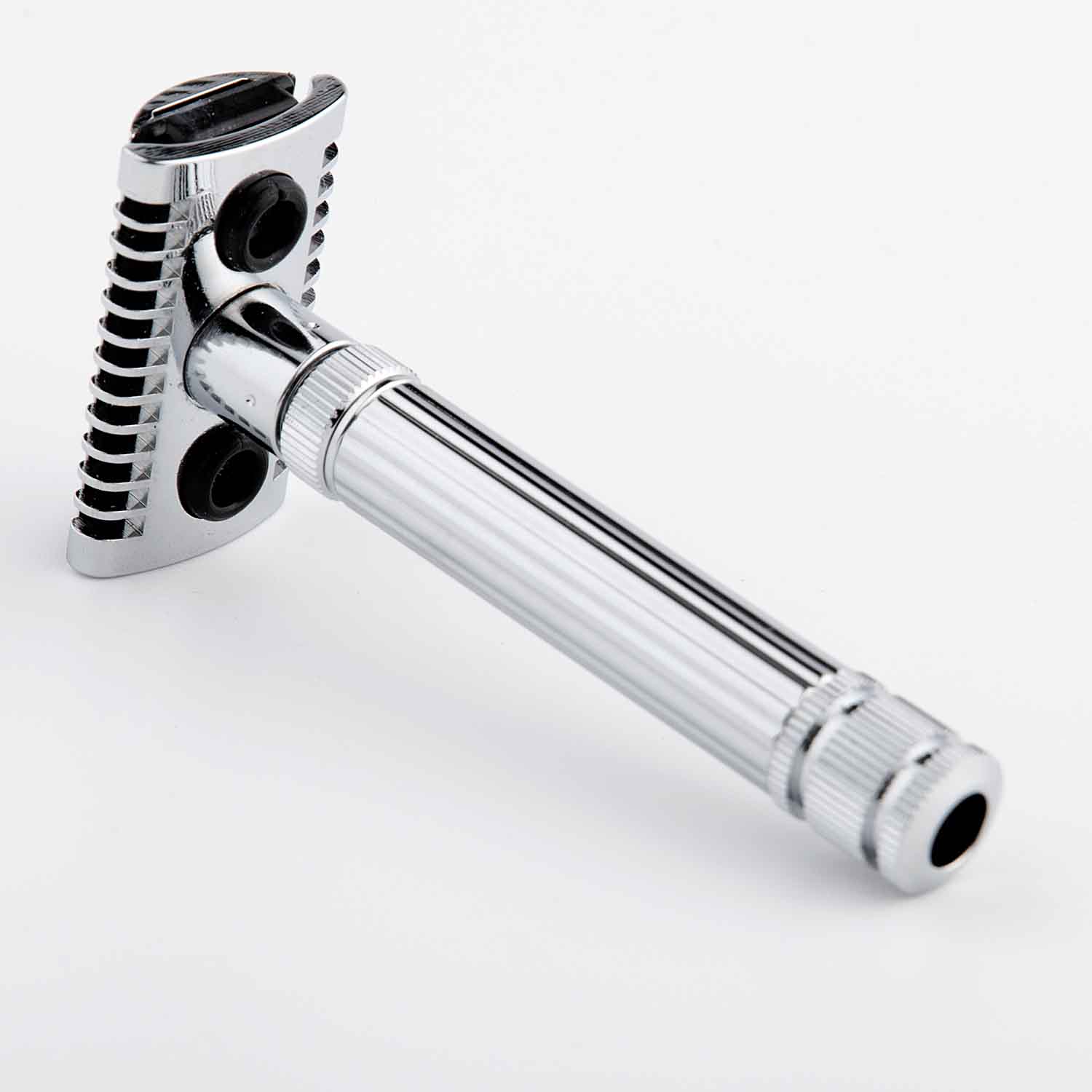 Tělo je vyrobeno z masivní mosazi s chromovanou povrchovou úpravou, která zajišťuje odolnost proti korozi a luxusní vzhled. Velká rukojeť poskytuje pevný úchop, perfektní vyvážení a vysokou stabilitu při holení. Díky hmotnosti přibližně 80 g pracuje strojek svou vlastní vahou, takže není nutné tlačit na pokožku, což výrazně snižuje riziko podráždění a mikropořezání. Celková délka kolem 93 mm a šířka hlavy 42 mm zajišťují ideální kontrolu i při detailním holení kontur.