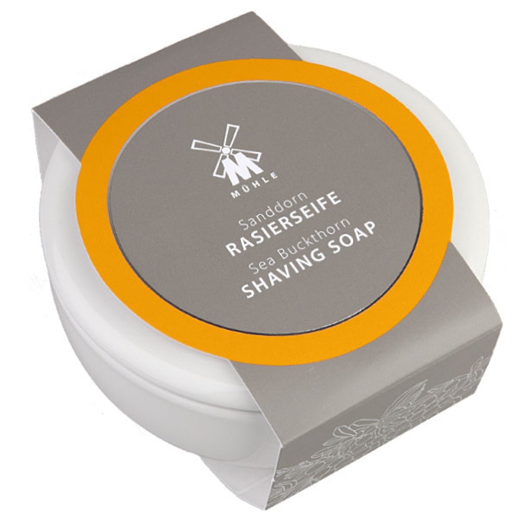 Holicí mýdlo Mühle Sea Buckthorn v porcelánové misce bílé barvy určené pro všechny typy pleti. Použitý rakytník je získáván z pobaltských přímořských oblastí a je znám vysokým obsahem vitamínu C, stopových prvků a minerálů. V mýdle je použitý pro regeneraci buněčné struktury. Jeho svěží ovocná kompozice obsahuje vůni pomerančů a citronů.